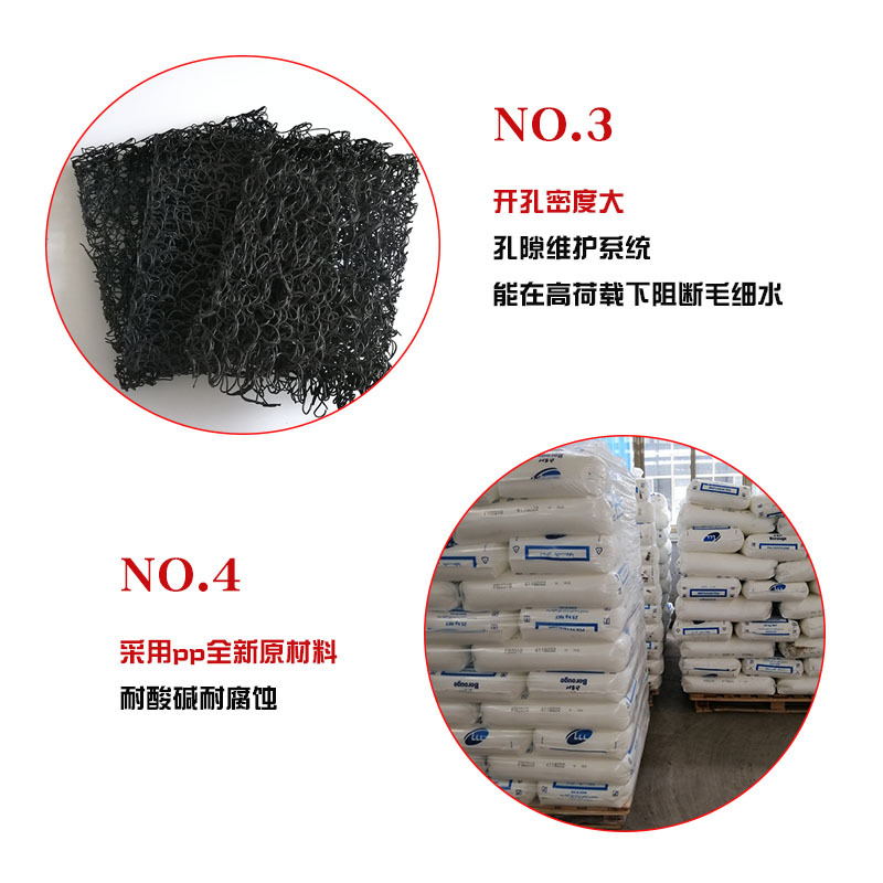 土工席墊與無(wú)紡?fù)凉げ紡?fù)合后,能在掩埋的封閉覆蓋層之下,將匯集滲透過(guò)土壤覆蓋層的雨水或堆場(chǎng)本身排放的污水,利用其獨(dú)特的排水功能,按照工程要求從土工席墊夾層中有序排放,而不會(huì)形成淤堵。因此可以避免因土壤覆蓋層吸水飽和而產(chǎn)生可能的滑動(dòng)問(wèn)題。土工席墊既能排水,同時(shí)也可排放土壤(特別是垃圾廢棄物)中因發(fā)酵產(chǎn)生的沼氣,在垃圾填埋場(chǎng)中應(yīng)用尤其適用。土工席墊與HDPE土工膜結(jié)合應(yīng)用時(shí),同時(shí)能起到很好地保護(hù)HDPE膜不被穿刺的作用。